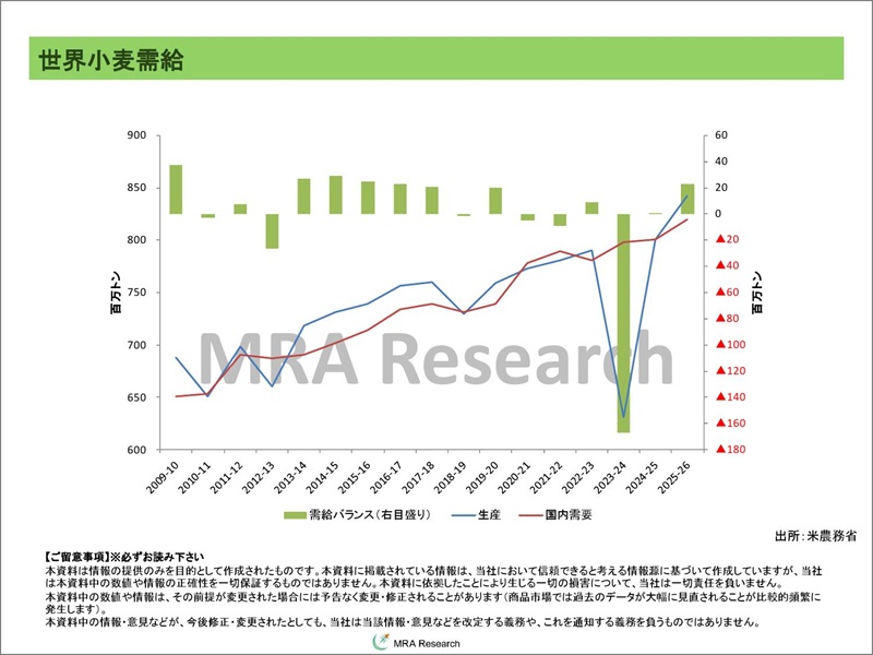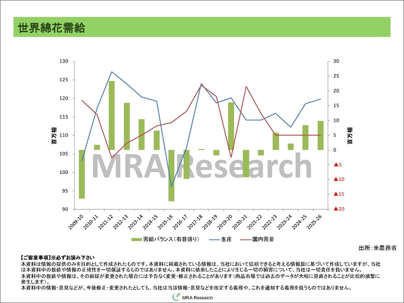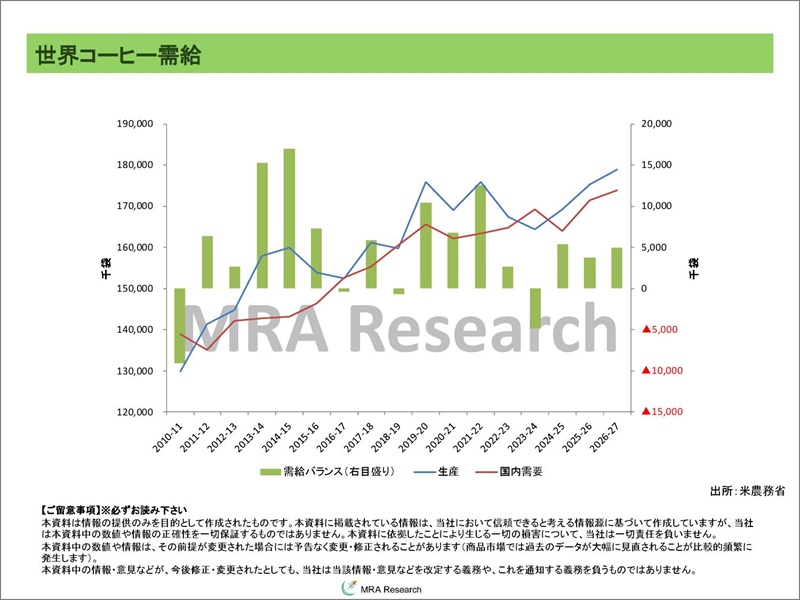2026-02-16世界需給動向<農産品> ファンダメンタルズ情報 トウモロコシ・大豆・小麦・コーヒー・粗糖・綿花の需給バランス推移グラフです。 過去のデータも含めて生産・需要データとも見直しされることがあります。 ※当データは定期的に更新されます。
