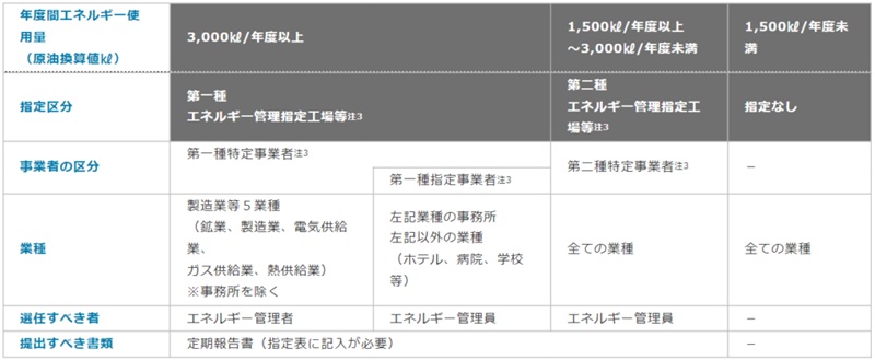 事業者全体のエネルギー使⽤量(原油換算値)が合計して1,500kℓ/年度以上である場合は、そのエネルギー使⽤量を国に届け出て、特定事業者の指定を受ける必要がある。また、コンビニや外食などフランチャイズチェーン事業等の本部とその加盟店との契約等にエネルギー使用に関する取り決めがある場合で加盟店を含む事業全体の合計で1,500kℓ/年度以上の場合は、その本部が「特定連鎖化事業者」の指定を受ける必要がある。そして、さらに個別の⼯場や事業場等の単位で1,500kℓ/年度以上である場合は、各々が「エネルギー管理指定⼯場等」(1,500kℓ以上は第二種、3,000kℓ以上は第一種)の指定を受ける必要がある。