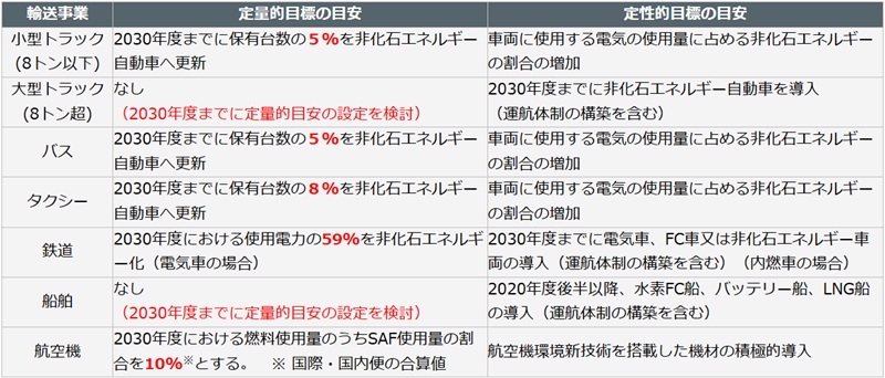 各特定輸送事業者は非化石目標を設定する。省エネ法の告示で定める輸送区分ごとの目標目安は図表2の通り。なお、非化石エネルギーを使用する輸送機器の技術開発の見通しが定かでない輸送モード(大型トラック、船舶)については、「定性的」な目標として省エネ法の告示で設定される(今後の技術開発動向や新たな政府目標等の策定等を見据え、2030年度までに定量的な目標目安を検討予定)。