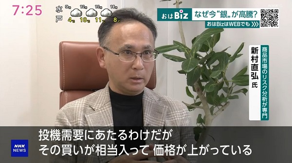 2026-01-19NHK「NHK NEWS おはよう日本」で新村がインタビューを受けました メディア出演 NHK「NHK NEWS おはよう日本」で新村がインタビューを受けました。 おはBiz<なぜ今“銀”が高騰?> 番組HPはこちらから。
