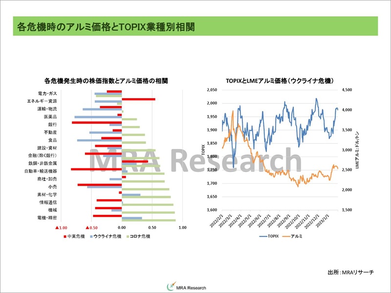 2026-03-18各危機時のアルミ価格とTOPIX業種別相関 MRA商品市場レポート 詳しい解説は「MRA商品市場レポート」にてご確認いただけます。 【MRA商品市場レポート】について 価格リスクに関する無料のご相談はこちらから 調達コストの削減・安定化 電力コストの削減・安定化 「調達・購買・財務担当者のための 原材料の市場分析入門」(ダイヤモンド社)
